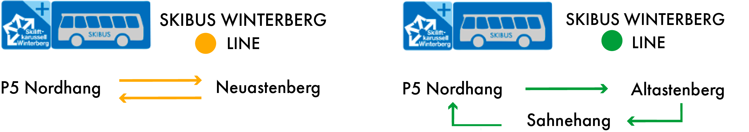 Green line: This line goes to the Altastenberg ski carousel and stops there at the "Astenstraße" regular bus stop in front of the Wemhoff sports shop, not far from the Kapellenhang car park and lift mountain station in Altastenberg. Additional stop on demand at the Sahnehang. Both lines also stop at Winterberg station. The exact departure times can be found in the timetable.
